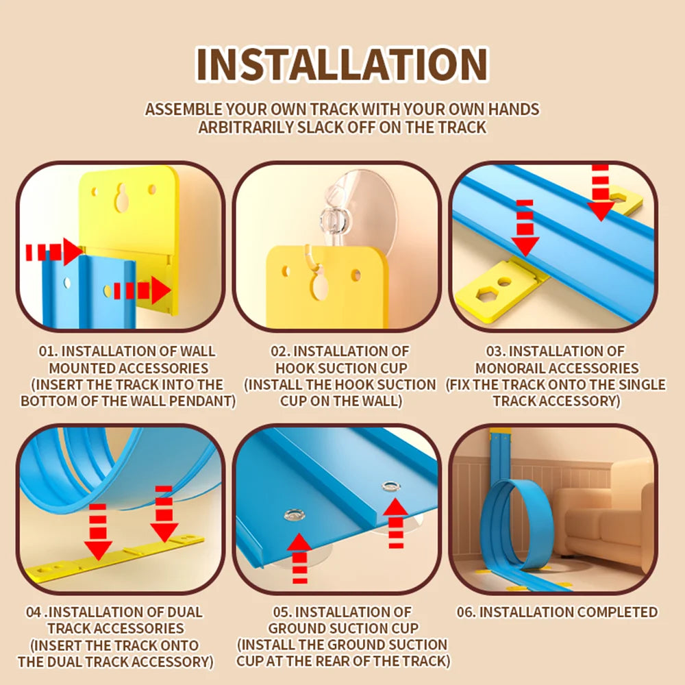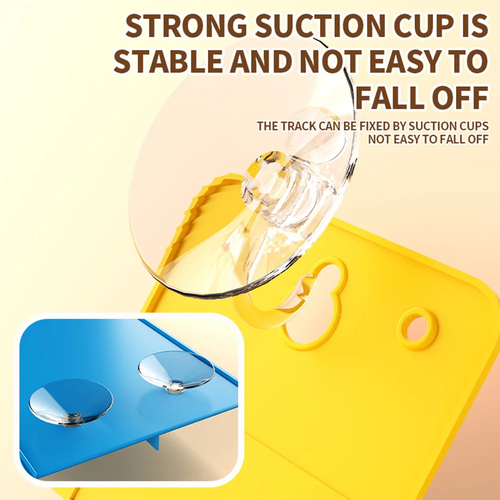 - 【Race Anywhere】 15 Ft Starter Set are equipped with strong suction cups that firmly stick to smooth surfaces like windows, tiles, tables, or car doors. Your living room wooden wall? A raceway. Bathroom mirror? Why not! When playtime is over, just roll it up—easy to store, perfect for on-the-go fun