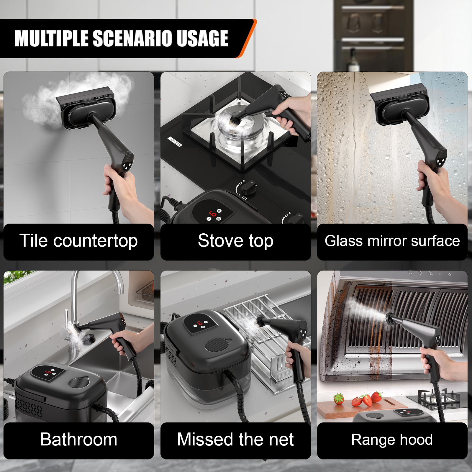 - [Powerful Handheld Steam Cleaner] This steam cleaner handheld delivers 221℉/105℃ high-temperature steam and 3Bar pressure in just 15 seconds, powered by 1500W for deep cleaning. The handheld steam cleaner effortlessly removes stubborn grease, grime, and bacteria from kitchens, tiles, and cars.