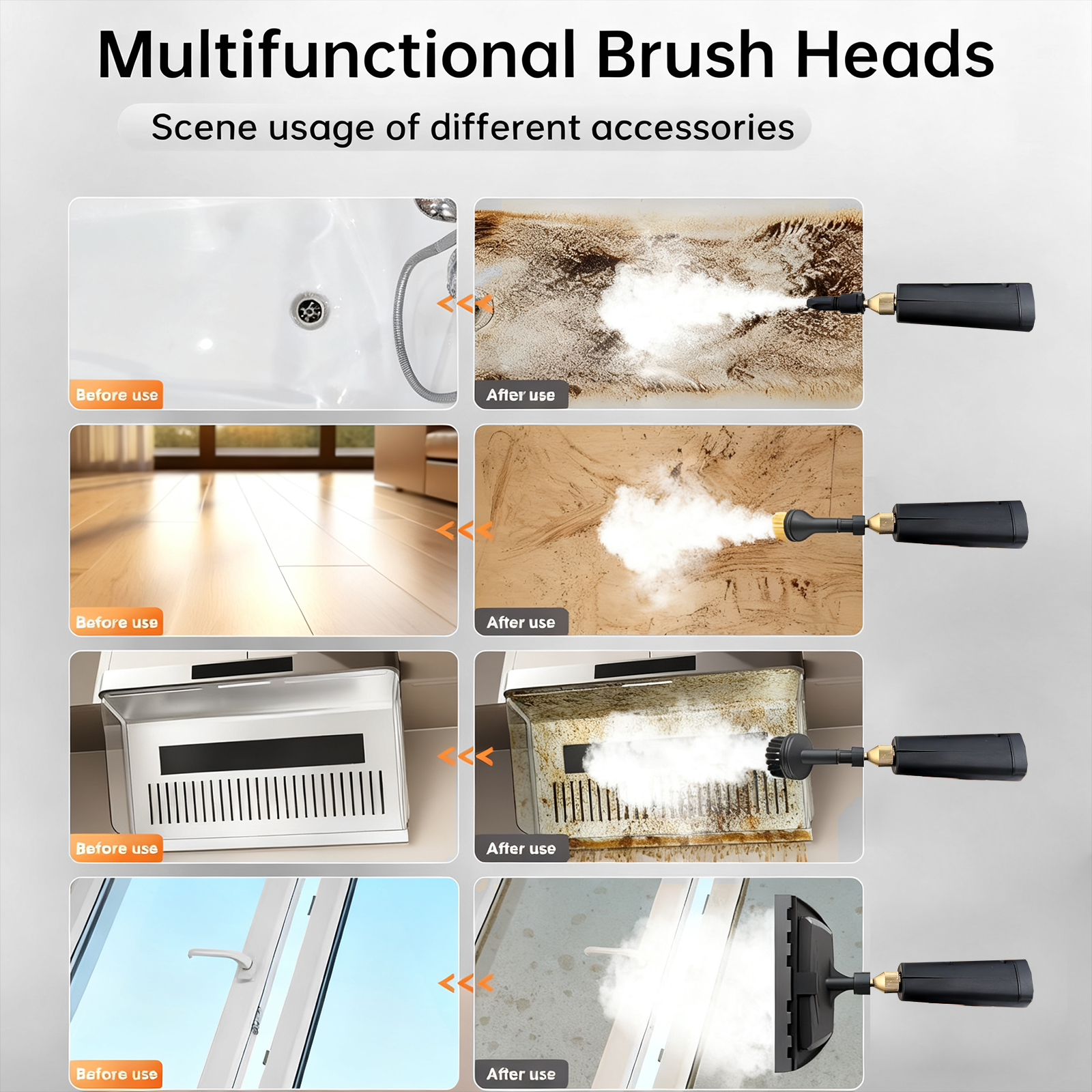 - [3 Multi-Surface Brushes Included] Unlock versatility with 3 specialized brushes:teel Brush: Scrub tough grease on grills or ovens.Plastic Brush: Gentle on tiles and sealed floors.Wide Plastic Brush: Cover large surfaces faster.This steamer for cleaning is your all-in-one solution for kitchens, bathrooms, and vehicles.