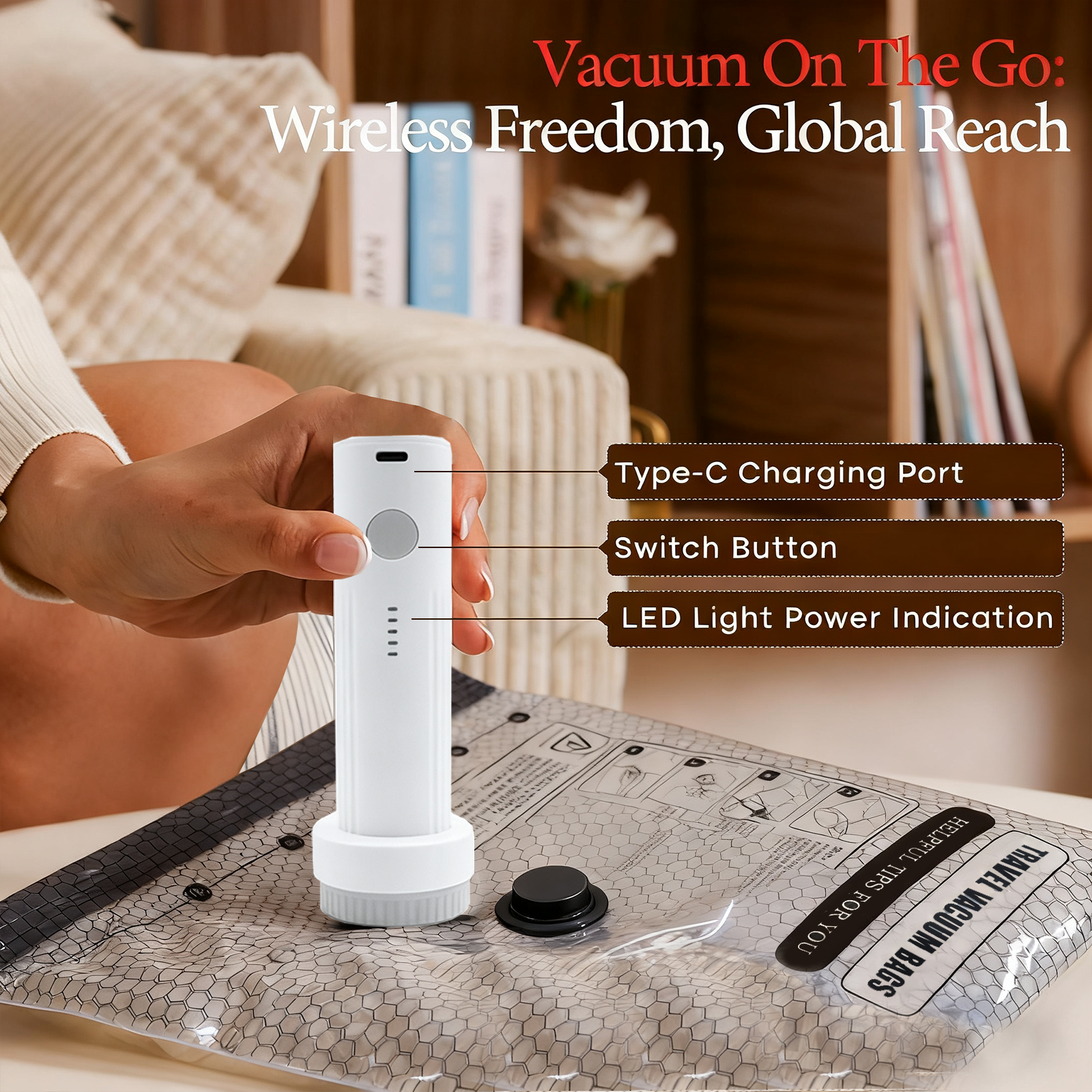 - Rechargeable & Cordless for Travel – Powered by a 1500mAh battery, this pump compresses up to 90 bags per charge. USB charging via laptop or power bank ensures global compatibility