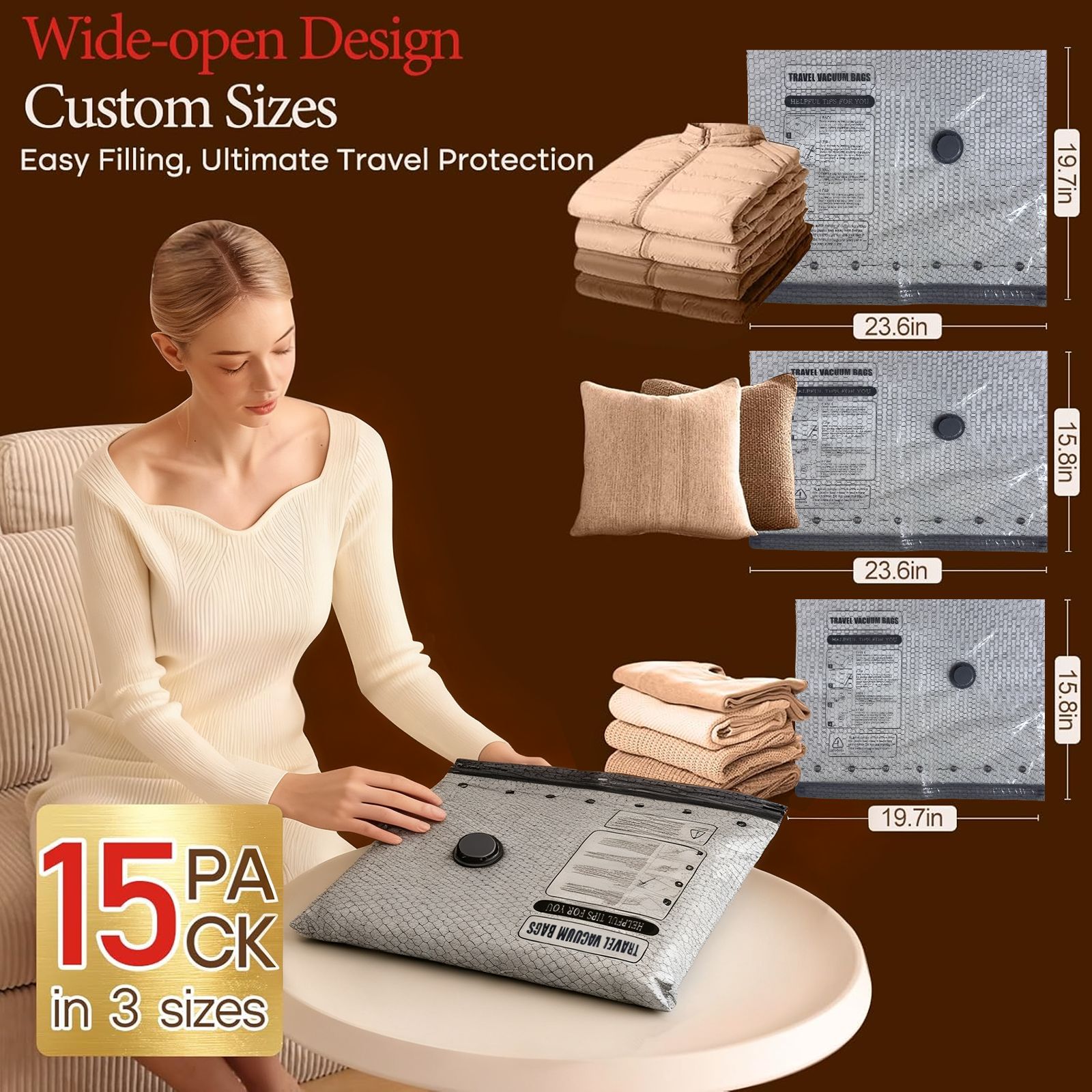 - Custom Travel-Size Storage Bags – Includes 9 vacuum bags in 3 sizes (15.8×19.7in, 15.8×23.6in, 19.7×23.6in), reducing luggage volume by up to 80% for versatile packing
