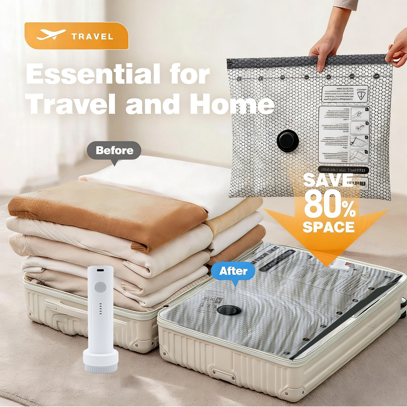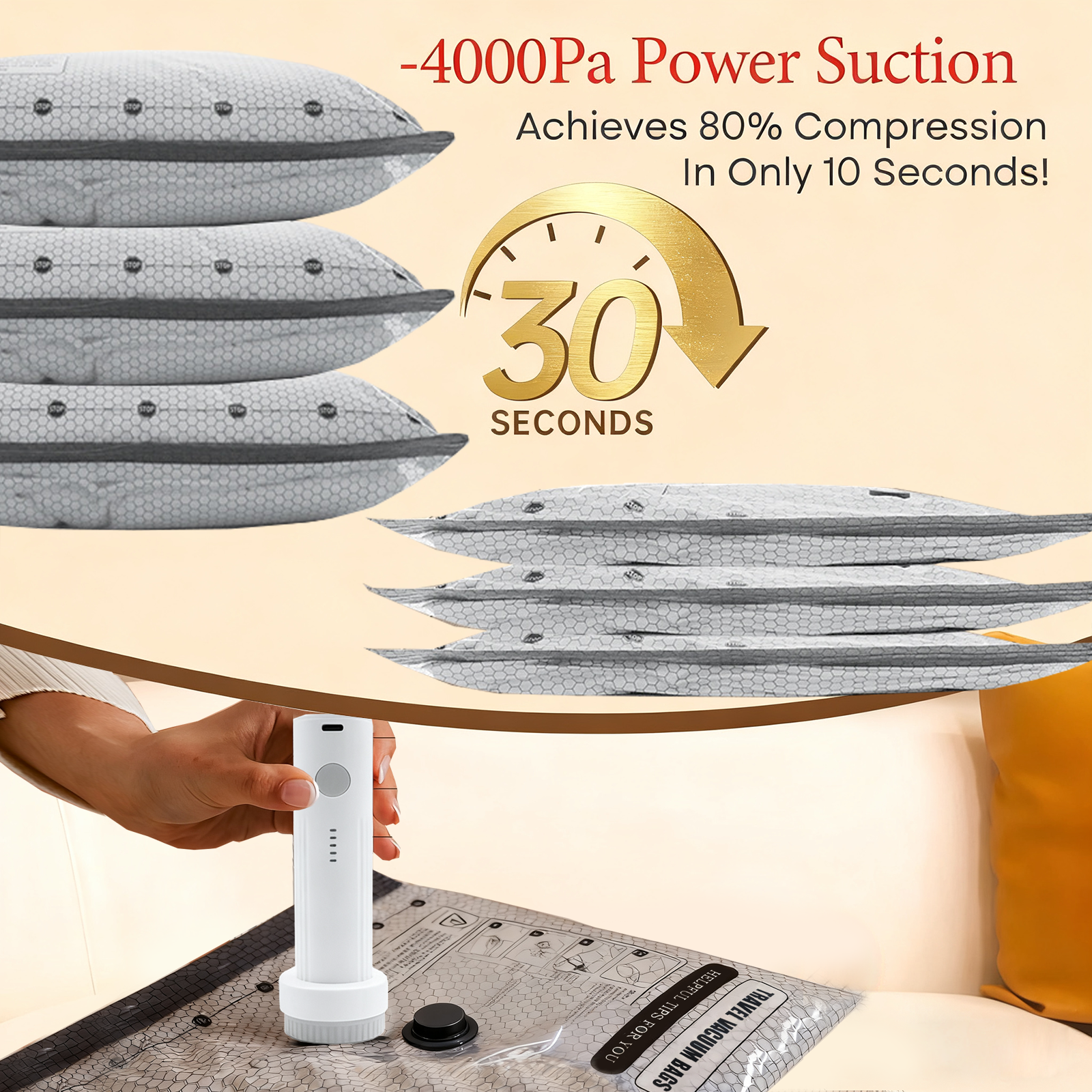 - Fast & Powerful Compression – With 4000Pa suction and 140L/min airflow, it compresses each bag in 10-15 seconds, completing a full set in under 3 minutes for efficient packing
