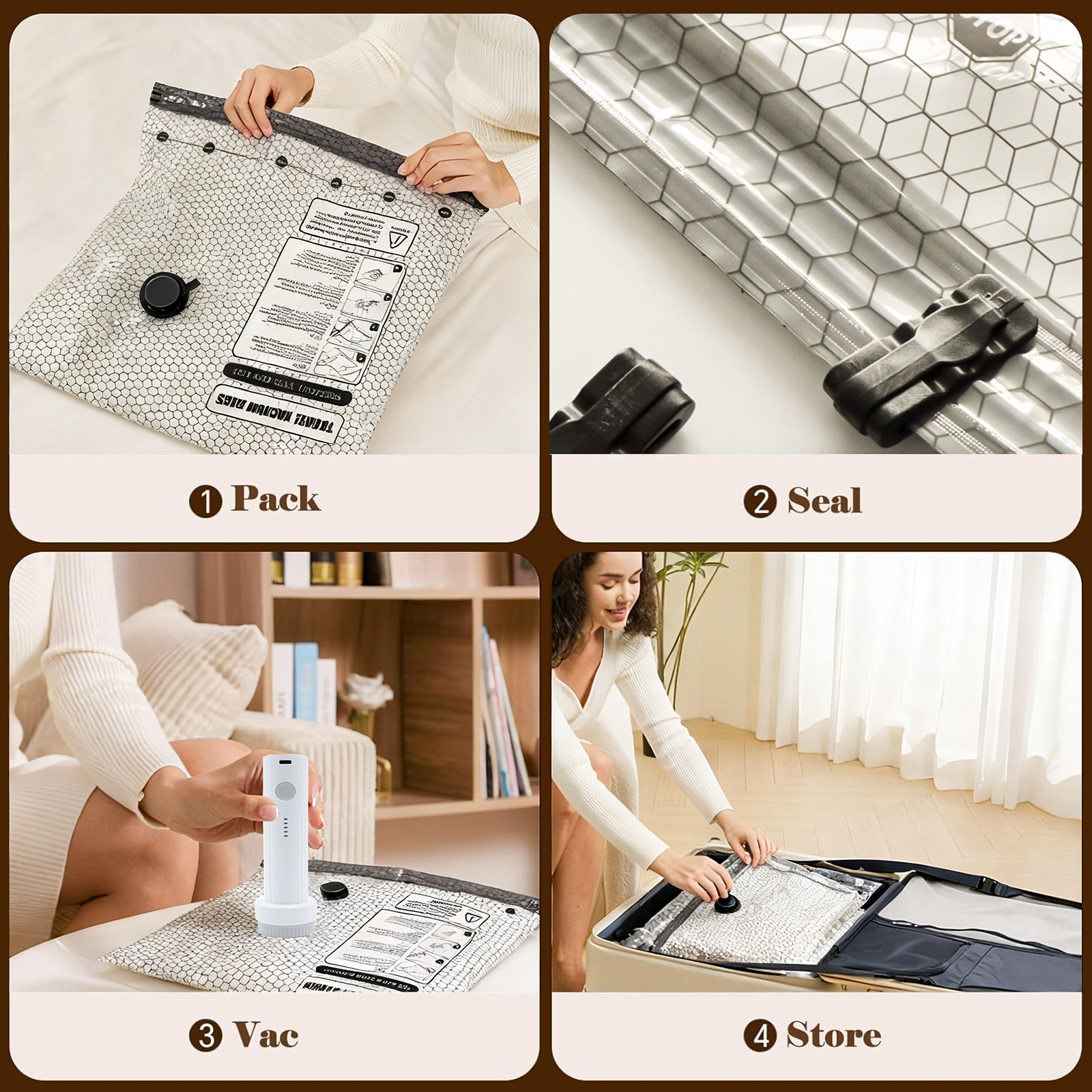 Vacuum organizer bags are a must-have for saving space in your home and can be used as a clothing organizer bag to compress your blankets, towels, clothes, stuffed animals, sheets and bedding. Effectively reduces the volume of clothing and helps you free up space in closets, basements, trunks, dorm rooms, attics and bedrooms. Vacuum seal bags for clothing travel 4 Steps for Easy Use 1. Put the items inside our vacuum storage bag 2. Pull back and forth along the double zipper several times with the slider unit. 3. Suck all the air out by the vacuum electric pump included 4. Close and secure the valve cap